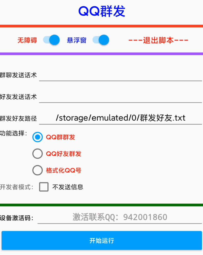 - QQ好友群发:需预先提取好目标好友QQ号,启动后脚本自行执行目标好友群发操作
